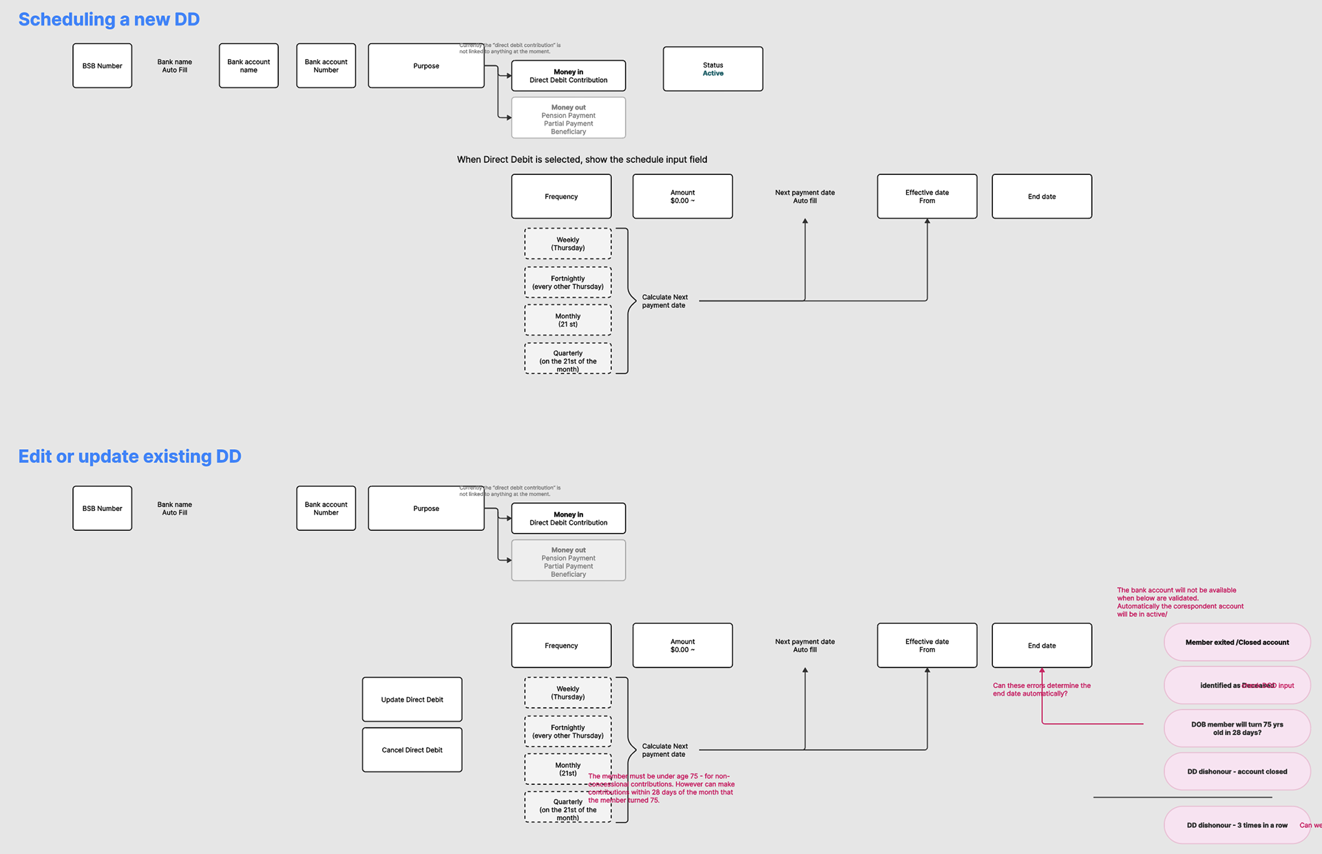 Rather than designing for permanence, I kept the solution deliberately lean — establishing clear data structures and status patterns that cleanly overwrap and transitioning to PayTo's instant payment model. The goal was operational stability now, and a smooth handoff in 18 months.